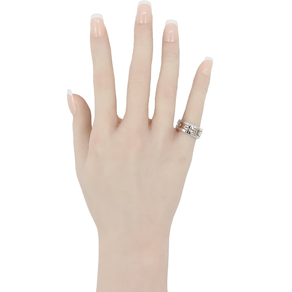 ブルガリの象徴的なデザイン【パレンテシ オープンワーク】コレクションより、オープン パレンテシ スモールリングです。K18WG(ホワイトゴールド)の洗練された輝きと、格子状の透かし模様が指元をスタイリッシュに演出します。幅8mmの存在感がありながら、透かしデザインにより重くなりすぎず、デイリーユースしやすい一本です。提携工房にて磨き仕上げ済みで、新品同様の輝きを取り戻した超美品SAランクの逸品です。