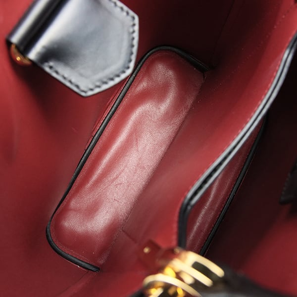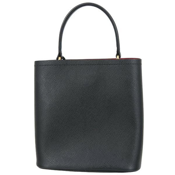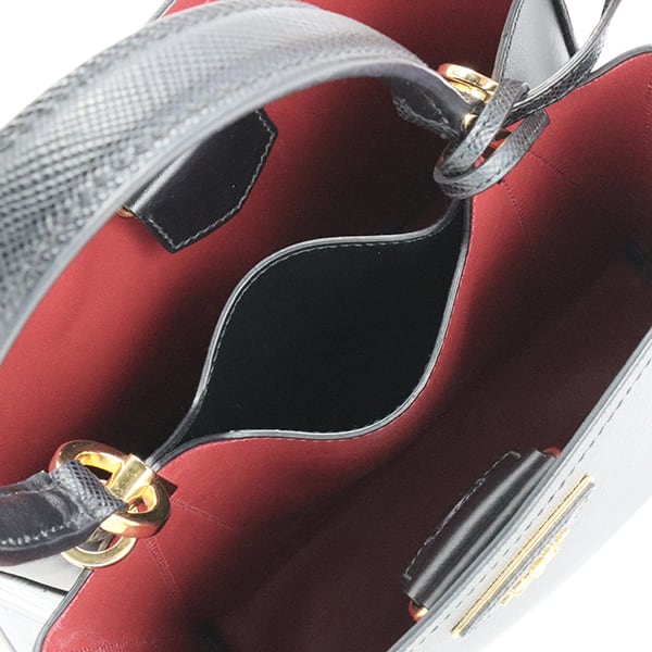 プラダ定番人気の【サフィアーノキュイル】を使用した2WAYバケットバッグ【パニエバッグ】です。外側のシックなブラックと、内側の鮮やかなフォーコ(レッド)のコントラストが魅力。中央仕切りでコンパートメントが2つに分かれており、整理しやすい構造です。取り外し可能なショルダーストラップ付きで、様々なコーディネートにマッチする中古美品Aランクの逸品です。ギャランティカードなど付属品も揃っています。
