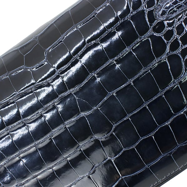 ※ミシシッピーワニとも呼ばれるクロコダイルのレザー。ミシシッピー原産の素材でクロコダイルに比べてウロコが大きいのが特徴。めのうで斑を磨くリセ(艶)加工仕上げ。