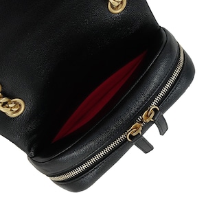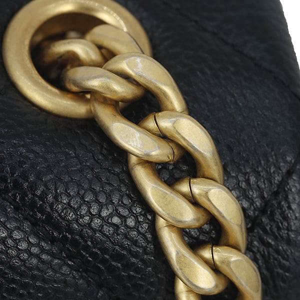 ヴィンテージ加工が施されたゴールドチェーンとターンロックが、クラシックかつ洗練された都会的な印象を演出。コンパクトなサイズ感ながら、スマートフォンや二つ折り財布といった必需品をスマートに持ち運べます。一部に保護シールが残るほどコンディションも良く、近年モデルの証であるメタルプレート仕様も嬉しいポイント。カジュアルなスタイルを究極のモードへと昇華させてくれる、特別な逸品です。