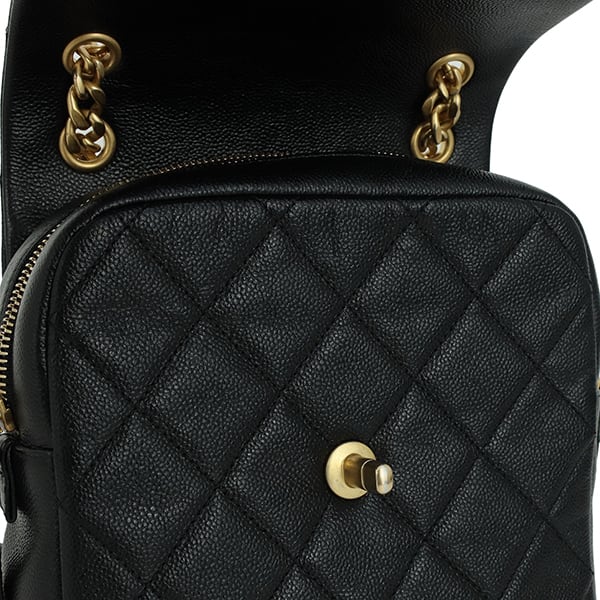 素材には、傷に強く、程よい艶感がラグジュアリーさを引き立てる「キャビアスキン」を採用。シックなブラックの外装に対し、ライニングには鮮やかなピンクが配されており、バッグを開けるたびに心躍るシャネルらしい遊び心が詰まったデザインです。