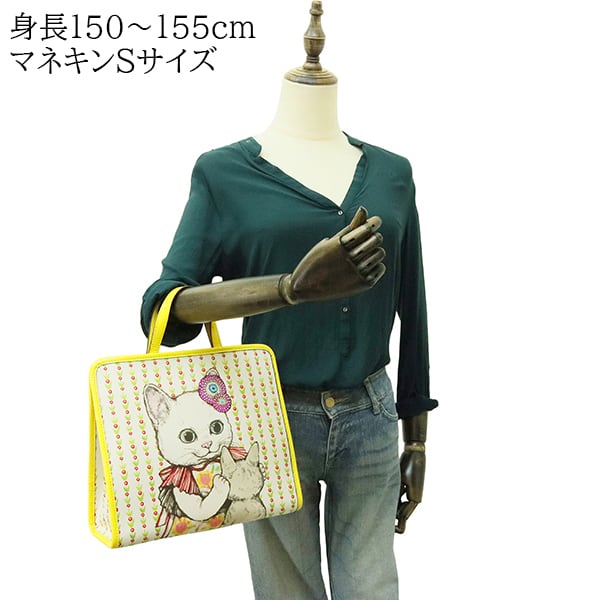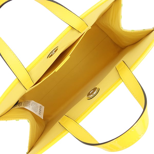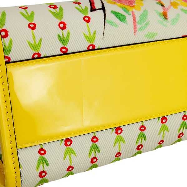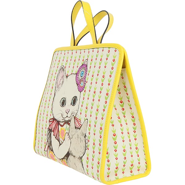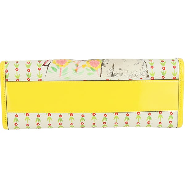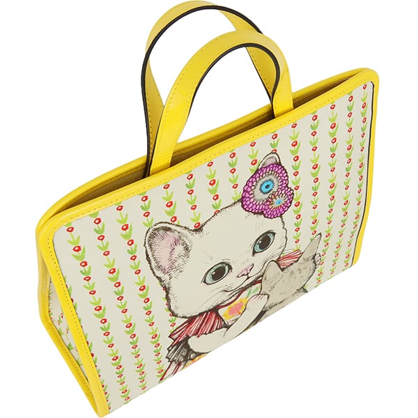 キャンバス地いっぱいに描かれた繊細な花々と、ヒグチユウコさんの絵本に登場するような愛らしくもミステリアスなキャラクターたちが目を引くデザイン。イエローのパテントレザートリミングが、遊び心あふれるヴィヴィッドなアクセントを添えています。