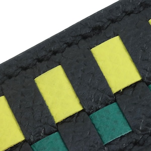 「トレサージュ(編み込み)」の技術を駆使し、職人の手作業で三色のレザーを丁寧に編み込んだ芸術的なショルダーストラップ。シックな「ノワール(ブラック)」をベースに、鮮烈な印象を放つ「ライム」と、深い知性を感じさせる「マラカイト」が織りなすコントラストは、見る人を惹きつける美しさです。