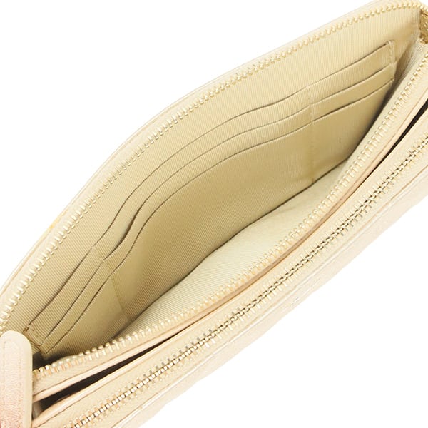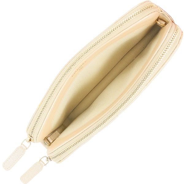機能面では、2つのファスナーコンパートメントと中央のフリーポケット、カードスロットを備え、スマートフォンや鍵などの必需品をスマートに集約可能。取り外し可能なショルダーストラップにより、軽快な「斜め掛け」、エレガントな「クラッチ」、そしてそのまま「長財布」としてもお使いいただける3WAY仕様です。デイリーのお出かけから華やかなパーティシーンまで、瞬時に装いをクラスアップさせる至高の逸品を、ぜひお手元に。