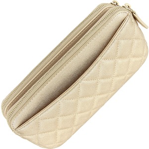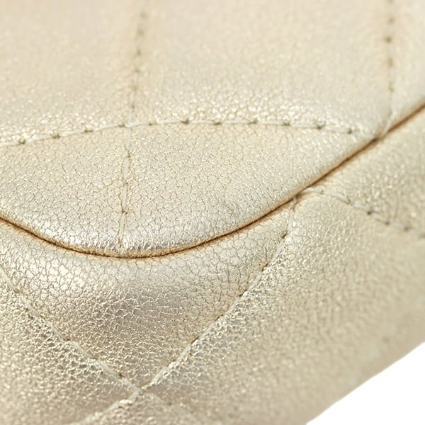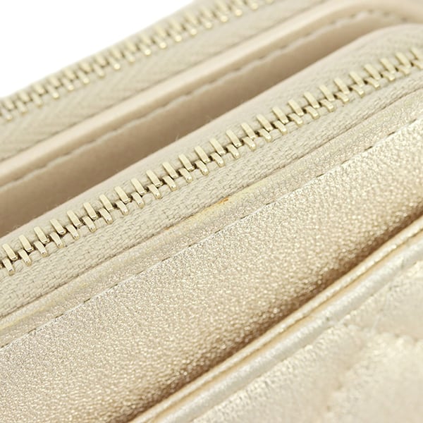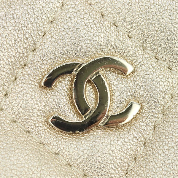 柔らかな質感と上品な光沢が魅力のラムスキンに、華やかな「ゴールド」を纏わせた贅沢な仕上がり。同色のゴールド金具が輝きを添え、ジュエリーのようにコーディネートを格上げしてくれます。2021年製造の「31番台」という高年式モデルならではの、ふっくらとしたキルティングの質感が保たれています。