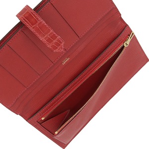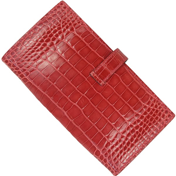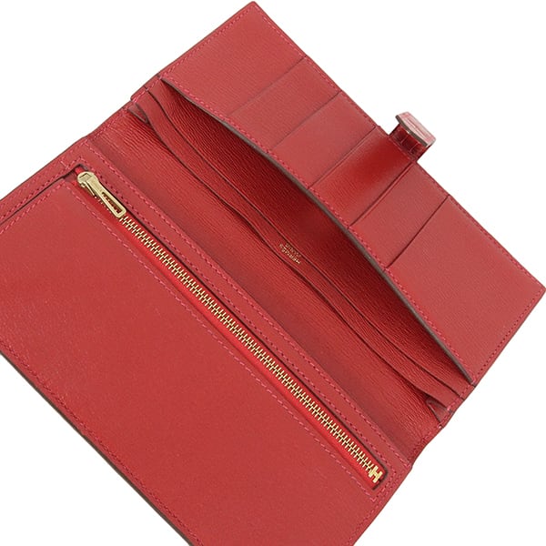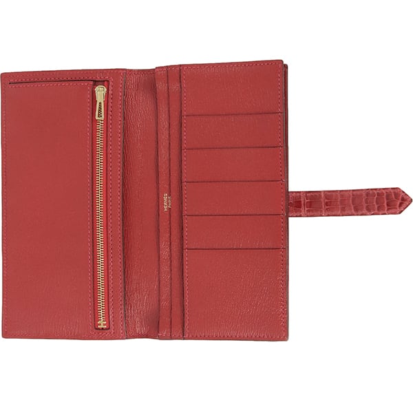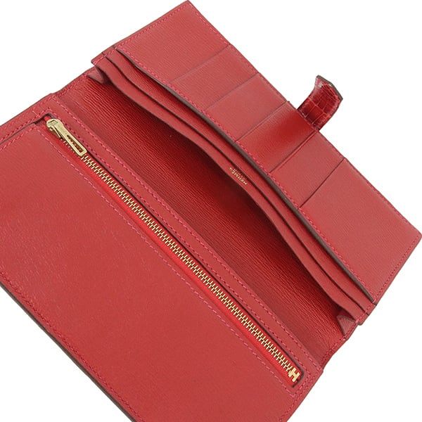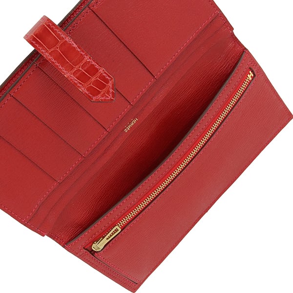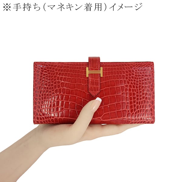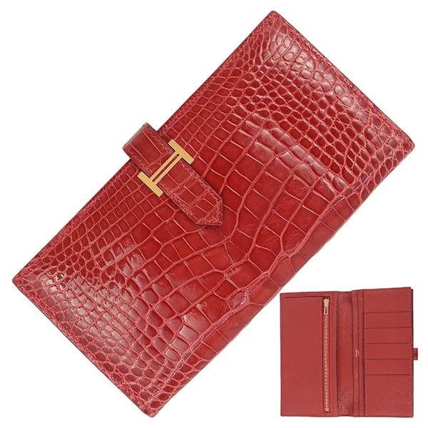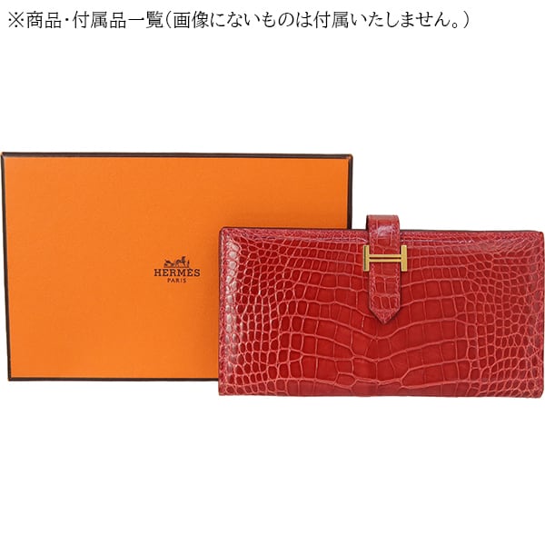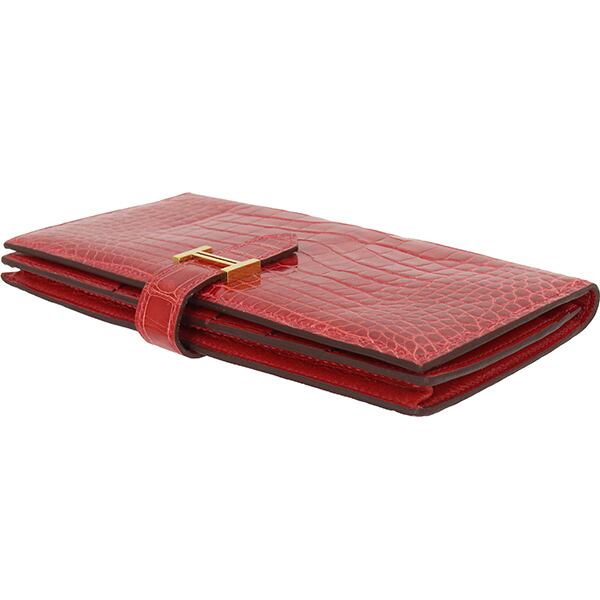 Used HERMES ベアンスフレ アリゲーター リセ レッド系 イエローゴールド金具 C刻印 二つ折り 長財布 Hロゴ ベルト開閉 美品
