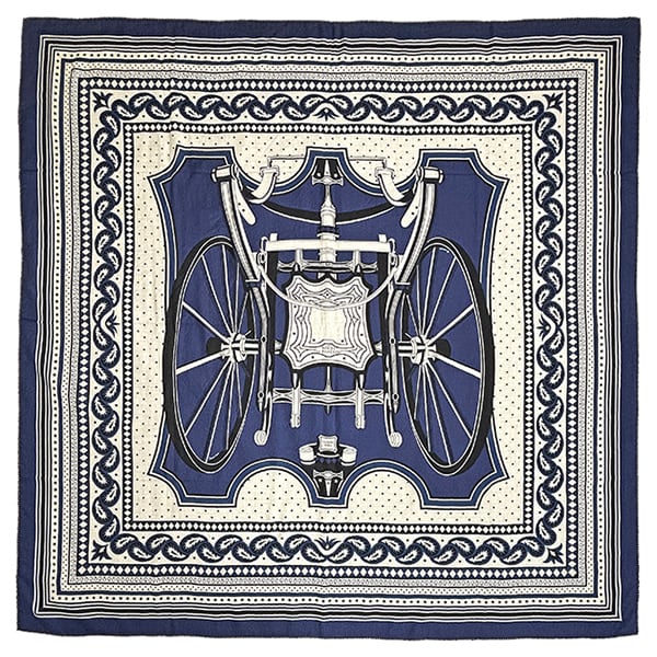 こちらは2024秋冬コレクションの「四輪馬車の車輪(Les Roues de Phaeton)」。繊細かつ力強いグラフィックが、カシミヤ70%・シルク30%という至高の混紡素材に鮮やかに描かれています。熟練の職人による「ルロタージュ仕上げ(手作業の縁かがり)」が施された贅沢な逸品です。