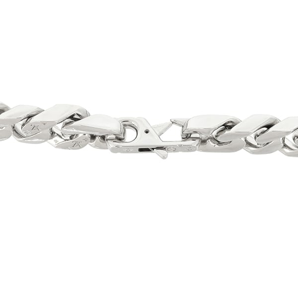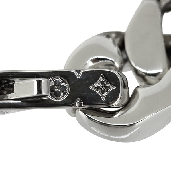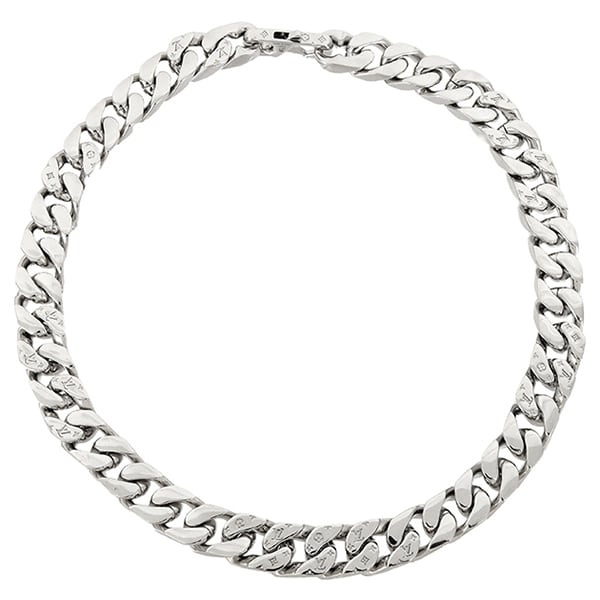 故ヴァージル・アブローが手掛けたこのモデルは、クラシカルな喜平チェーンにメゾンのアイコンであるモノグラム・パターンをランダムに刻印した、ストリート感とエレガンスが共存するデザインです。重厚感のあるメタル素材にシルバーカラーの仕上げを施し、首元に圧倒的な存在感と洗練された印象を与えます。