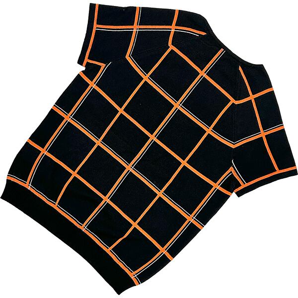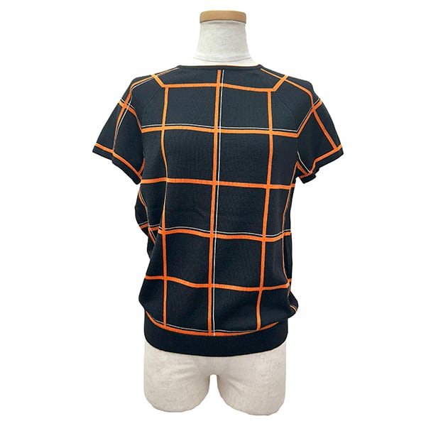 ブラック生地にオレンジとホワイトのラインが映える、エルメスのチェックニットスが入荷。半袖なので、春や秋の季節に最適で、スカートやパンツとの相性も抜群です。